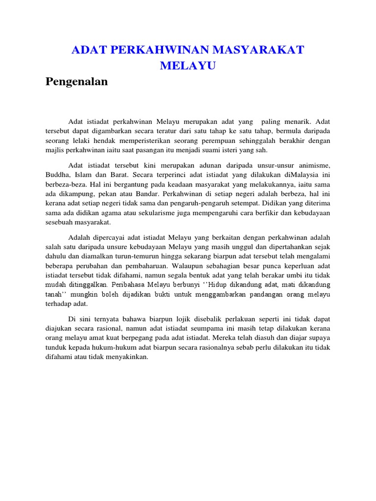Adat perkahwinan masyarakat melayu di malaysia. Adat resam perkahwinan melayu tradisional dipegang teguh oleh kebanyakan orang melayu sejak turun temurun baik di bandar mahupun di luar bandar. Adat ini juga dipanggil meninjau atau menengok dalam budaya melayu adat ini merupakan tahap awal menjodohkan ter una dan dara yang melibatkan pertemuan antara wakil keluarga teruna dengan orang tua pihak dara pertemuan tersebut dianggap penting untuk menghormati keluarga pi. Sesuatu upacara dalam peringkat perkahwinan itu akan dijalankan dengan meriah dan penuh adat istiadat. Turut dibincangkan di dalam adat meminang ini adalah berkenaan jumlah hantaran dan bilangan ahli rombongan yang akan datang pada majlis pertunangan bagi memudahkan pihak gadis membuaat persiapan.