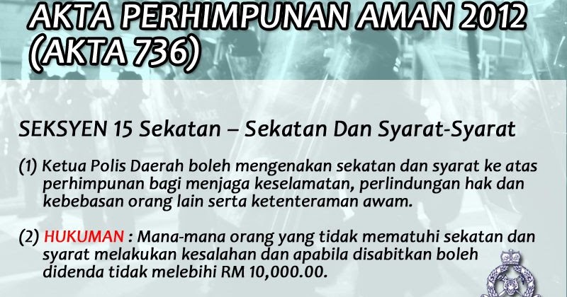 Tafsiran bahagian ii hak untuk berhimpun secara aman dan tanpa senjata 4. Hak orang yang mempunyai kepentingan bahagian iii. Those who object this act believe that it is an attempt to prevent any form of assembly from taking place. Suatu akta yang berhubungan dengan hak untuk berhimpun secara aman dan tanpa senjata dan untuk memperuntukkan sekatan sekatan yang didapati perlu atau suai manfaat yang berhubungan dengan hak itu demi kepentingan keselamatan persekutuan atau mana mana bahagiannya atau ketenteraman awam.