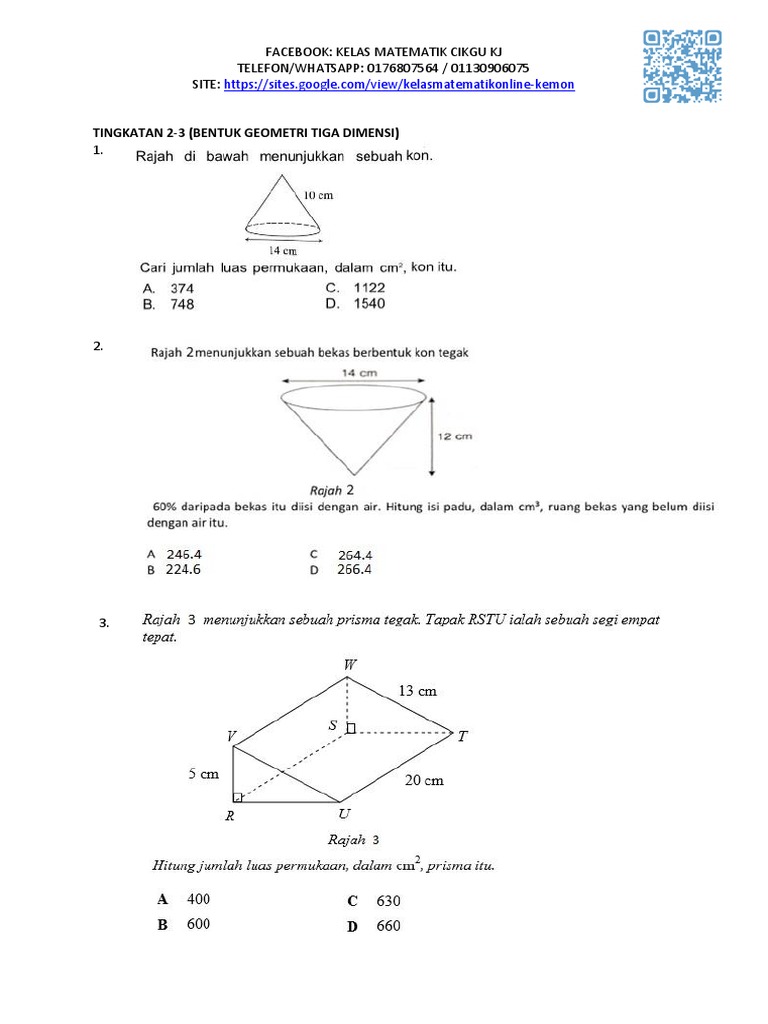 Pola dan jujukan bab 2. Bentuk geometri tiga dimensi yang akan kaji bentangan pengiraan luas permukaan dan isi padu. Bulatan bab 6. Bab 10 kecerunan garis lurus.