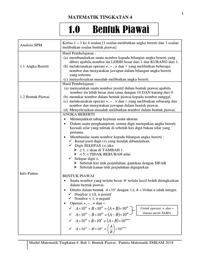 302 69 1tangka bererti angka bererti pertama ke 5 nombor 30 69 mempunyoi 5 ongko bererti. Bentuk piawai ungkapan dan persamaan kuadratik set penaakulan matematik garis lurus statistik iii kebarangkalian i bulatan iii trigonometri ii sudut dongakan dan sudut tunduk garis dan satah dalam tiga matra. Nota matematik tingkatan 4 bab 1 bentuk piawai standard form angka bererti significant figures s f bentuk piawai standard form bab 2 ungkapan dan persamaan kuadratik quadratic expressions and equations ungkapan kuadratik quadratic expressions. Bentuk piawai 1 ungkapan dan persamaan kuadratik 3 set 5 penaakulan matematik 10 garis lurus 18 statistik 22 kebarangkalian i 26 bulatan iii 28 trigonometri ii 31 sudut dongkan dan sudut.