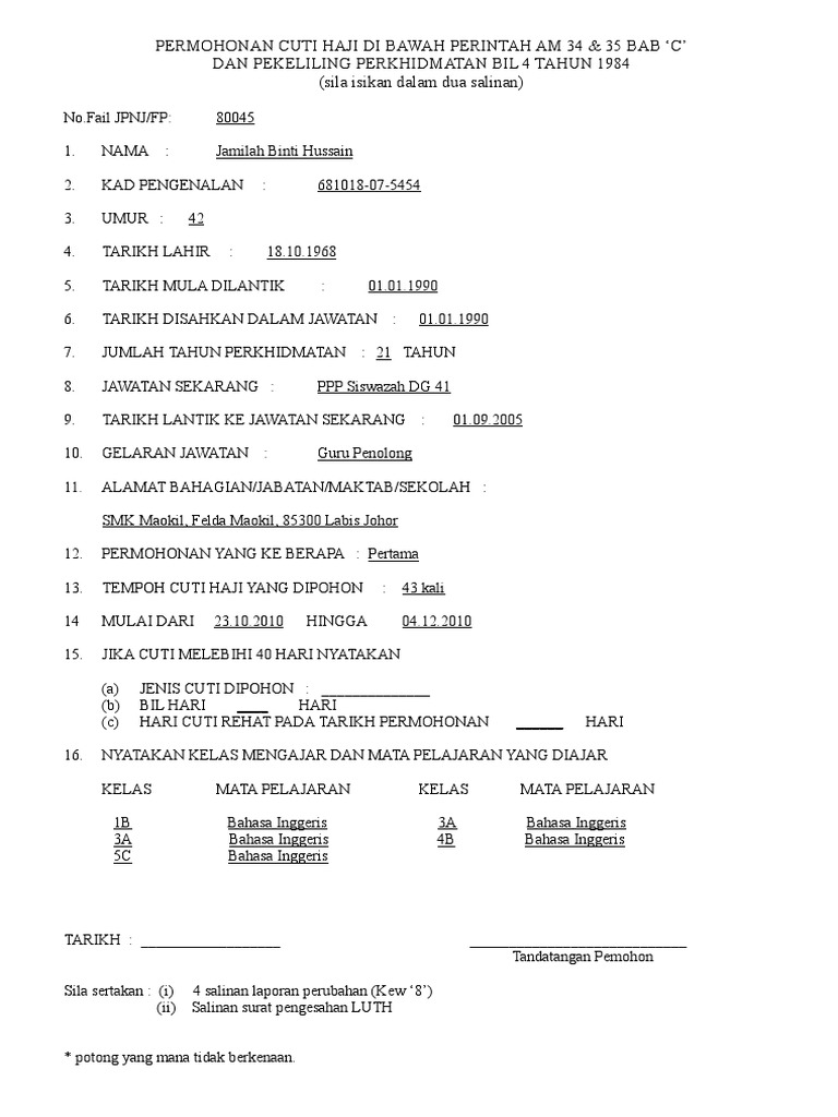 Borang permohonan cuti haji terkini. Mereka yang tiada latihan asas perguruan ditempatkan di sekolah bagi mengisi kekosongan sementara guru tetap disebabkan oleh cuti bersalin cuti sakit cuti mengerjakan haji cuti berkursus atau lain lain hal yang dibenarkan. Perakuan permohonan saya dengan ini mematuhi segala peraturan yang ditetapkan di perenggan 6 i ii dan perenggan 10 surat pekeliling am bilangan 3 tahun 2012. Berdasarkan kepada tarikh tahun tahun yang lepas tarikh pengumuman dan pengagihan kadar dividen dan bonus tabung haji tahun 2019 akan diumumkan sekitar suku pertama 2020. Maklumat permohonan guru ganti guru ganti.