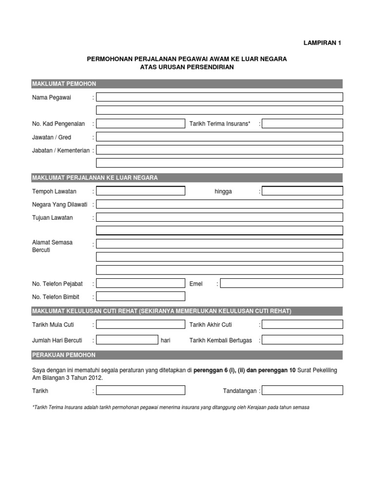 Permohonan perjalanan pegawai awam ke luar negara atas urusan persendirian. Borang permohonan perjalanan ke luar negara lampiran 1 pdf. Surat pekeliling am bahagian sumber manusia bil 2 2018 pages 1 5. Borang permohonan ke luar negara persendirian borang permohonan format pdf borang permohonan format word sebarang pertanyaan sila berhubung dengan urusetia keluar negara di ptj masing masing.