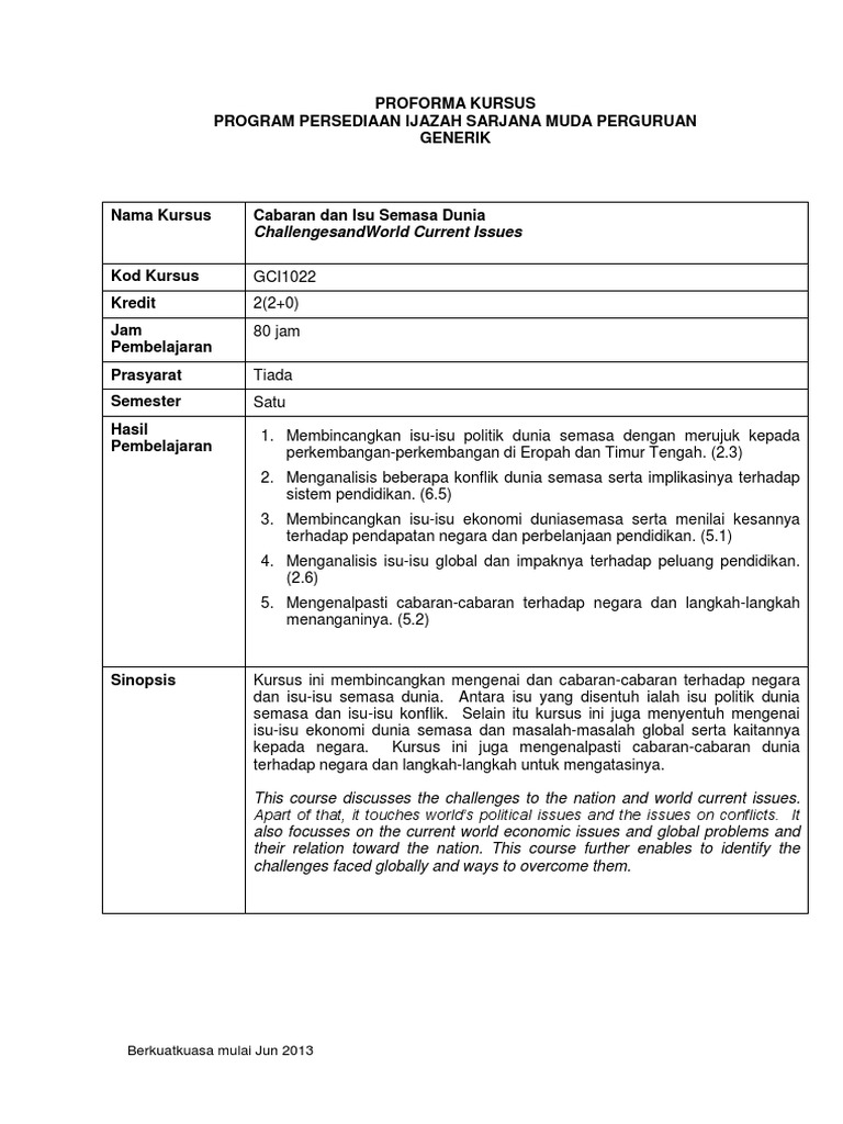 Selain itu kursus ini ju. Cabaran dan isu semasa dunia dengan kodnya gci1022 merupakan salah satu subjek yang perlu dipelajari semasa ppismp semester 1. Patrick dixon 1995 juga menyatakan bahawa kejuruteraan genetik membuka lebih banyak peluang untuk penghasilan senjata untuk tujuan kemusnahan manusia. Kursus ini membincangkan mengenai dan cabaran cabaran terhadap negara dan isu isu semasa dunia.