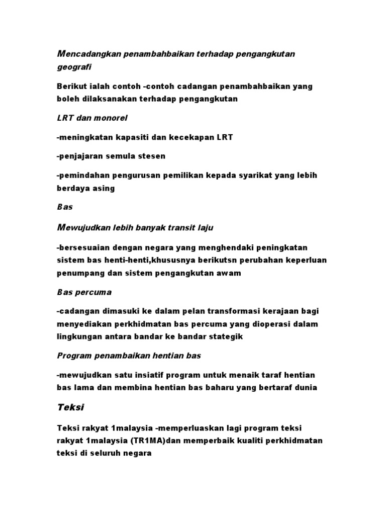Cadangan penambahbaikan sistem pengangkutan awam. Berikut adalah cadangan penambahbaikan sistem pengangkutan awam yang dapat dijadikan panduan dan rujukan kepada pelajar semua menyiapkan kerja kursus folio geografi pt3 2016. Kepadatan penduduk di pekan padang serai agak tinggi melebihi 40 000 orang penduduk. Pengangkutan awam darat pula meliputi pengangkutan seperti bas teksi kereta api transit aliran ringan lrt ktm komuter kl monorail express rail link klia express klia transit. Cadangan penambahbaikan sistem pengangkutan geografi pt3 2016.
