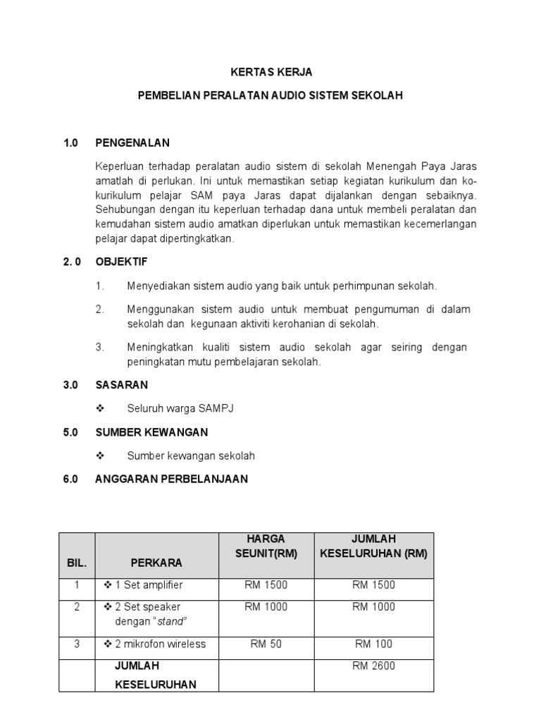 Tujuan tujuan kertas kerja ini dikemukakan kepada jawatankuasa pemandu ict jpict universiti malaysia sabah ums adalah untuk mendapat pertimbangan dan seterusnya kelulusan teknikal ict bagi nama projek. Contoh kertas kerja sekarang. 3 0 objektif 3 1. Kos untuk melaksanakan projek ini agak tinggi dan peruntukan prasekolah amat terhad.