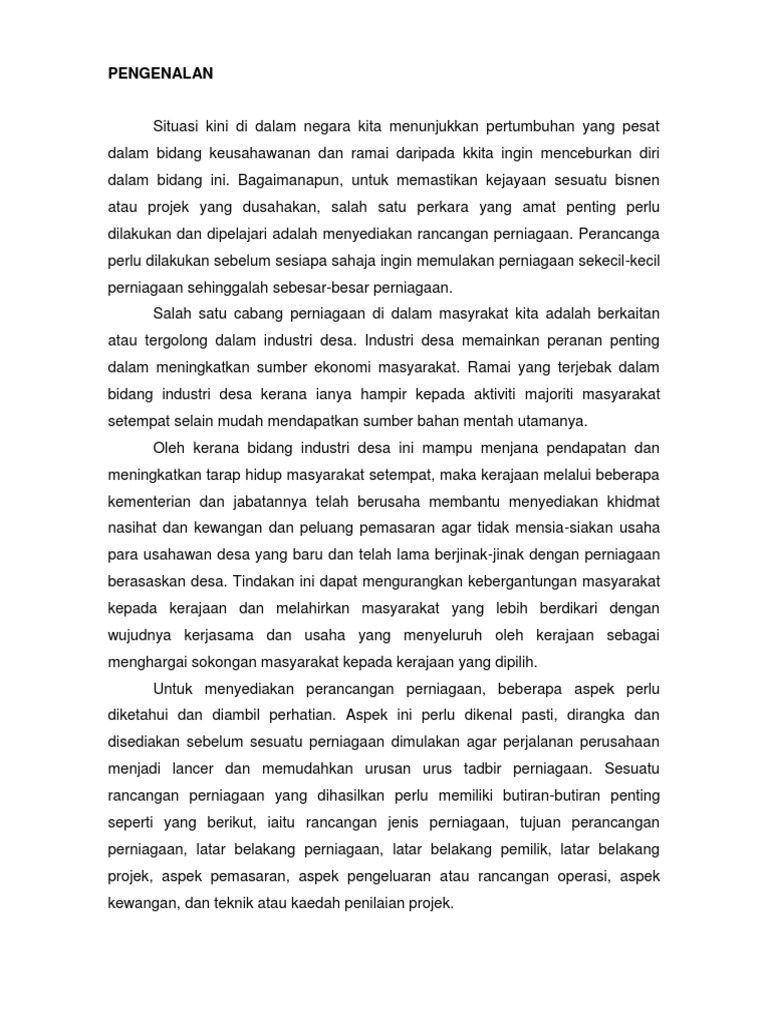 Contoh pengenalan rancangan perniagaan. Pekerja terdiri daripada ahli keluarga yang mempunyai pengalaman dan kemahiran dalam menguruskan perniagaan. Contoh ringkas rancangan perniagaan isi kandungan. 25 julai 2001 01234567 t 4. Isi kandungan muka surat 1 0 pengenalan 1 2 0 tujuan rancangan perniagaan 1 3 0 visi 1 4 0 misi 1 5 0 latar belakang pemilik 2 6 0 latar belakang projek 3 7 0 rancangan pentadbiran 3 8 0 rancangan pemasaran 5 9 0 strategi pemasaran 5 10 0 rancangan operasi 6 11 0 rancangan kewangan 7 12 0 penutup 7.