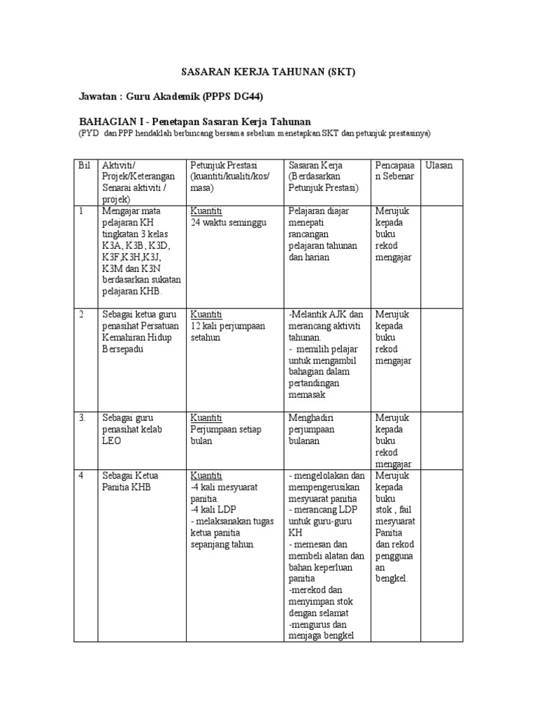 Contoh sasaran kerja tahunan guru 1. Penetapan sasaran kerja tahunan guru mata pelajaran contoh penetapan sasaran kerja tahunan pyd dan ppp hendaklah berbincang bersama sebelum menetapkan skt dan penunjuk prestasinya. Perjalanan aktiviti semua persatuan akademik diadakan mengikut jadual dan.