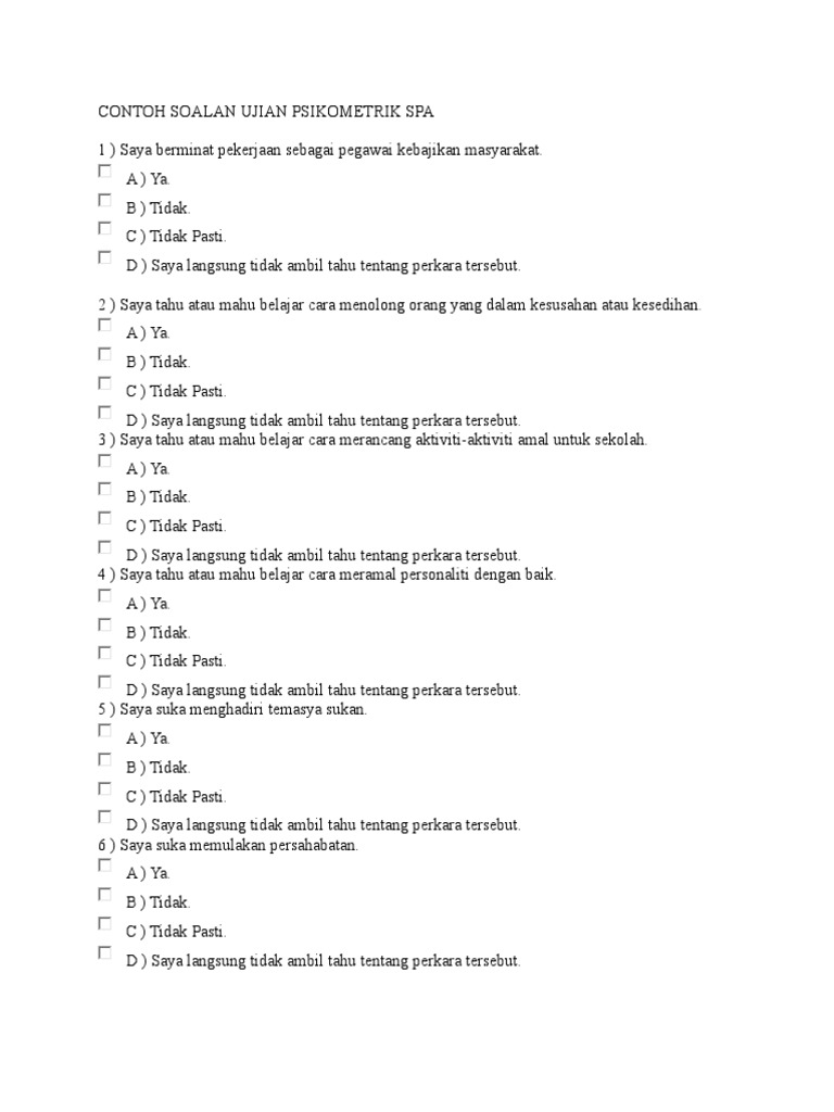 Contoh soalan psikometrik pdf. Apabila tiada lagi peluang kita tidak perlu lagi berusaha. C tidak pasti. Contoh soalan psikometrik spa turut disertakan untuk anda membuat latihan persediaan supaya tidak kekok semasa menghadapi peperiksaan online psikometrik nanti. Saya suka menegur pekerja bawahan saya di khalayak ramai.