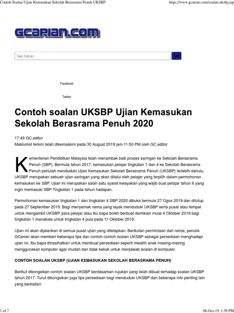 Panduan buat calon yang ingin ketahui contoh soalan uksbp bagi tahun 2019. Bermula tahun 2017 kemasukan pelajar tingkatan 1 dan 4 ke sekolah berasrama penuh sbp perlu menduduki ujian kemasukan sekolah berasrama penuh uksbp terlebih dahulu. Artikel ini ialah tentang ujian kemasukan sbp uksbp untuk tingkata 1 sahaja. Ibu bapa dan pelajar yang ada membuat permohonan kemasukan ke tingkatan 1 dan tingkatan 4 sekolah berasrama penuh sbp sedia maklum akan perlunya pemohon untuk menghadiri ujian kemasukan sekolah berasrama penuh atau ringkasnya uksbp pada tarikh yang telah ditetapkan.