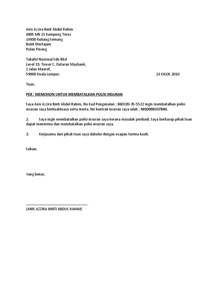 Contoh surat boleh didapati di bawah. 17b jalan bangsar 59200 kuala lumpur tel. Satu lagi cara yang boleh membatalkan polisi anda ialah jika anda biarkannya lupus lapse dengan mengabaikan pembayaran premium anda. Saya tidak pasti pula jika mahu tamatkan polisi melalui surat atau pos.