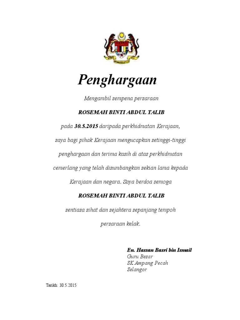 Contoh surat penghargaan perkhidmatan cemerlang. Contoh surat penghargaan perkhidmatan cemerlang in english contoh surat penghargaan perkhidmatan cemerlang gemilang contoh surat penghargaan perkhidmatan cemerlang akademik contoh surat penghargaan perkhidmatan cemerlang spm contoh surat penghargaan perkhidmatan cemerlang raya contoh surat penghargaan perkhidmatan cemerlang bersama contoh surat penghargaan tamat perkhidmatan contoh. Koleksi contoh ucapan tahniah konvokesyen jutaan terima kasih diucapkan kerana begitu tekun dan sabar memberi bimbingan didikan dan tunjuk ajar kepada saya selama ini tanpa mengenal erti penat lelah dan. Bersyukur kita pada hari ini kerana dapat bersama sama hadir di majlis anugerah perkhidmatan cemerlang apc dan jasamu. Yang berbahagia dato dr.