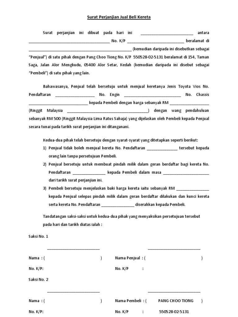 No 16 batu 6 jalan titi haji idris 06500 langgar kedah yang selepas ini dikenali sebagai penjual atau penyewa sewa beli pertama atau penama pertama sahaja dengan abdul basir bin wahab. Kebanyakkan kita jarang membuat perjanjian membeli kenderaan terutama kereta terpakai sehingga pembeli terpaksa menanggung pelbagai masalah dan juga saman tertunggak dari penjual. Contoh surat perjanjian ini seringkali dipergunakan untuk berbagai bidang dan hal seperti. 1 antara farisah farzana bt mohammad no k p.