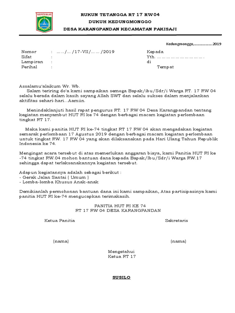 Contoh surat permohonan bantuan dana kegiatan 17 agustus. 001 hut ri 1995 malang 16 juli 1995. Contoh surat permohonan bantuan dana kegiatan 17 agustus kop surat nomor. Contoh surat permohonan bantuan dana peringatan hut ri 17 agustus contoh surat permohonan bantuan dana 17 agustus berhubung sebentar lagi kita akan memperingati hut republik indonesia pada tanggal 17 agustus maka tentunya banyak kegiatan kegiatan yang diselenggarakan untuk memperingatinya. Surat edaran 17 agustus 2019 hhrma job c.