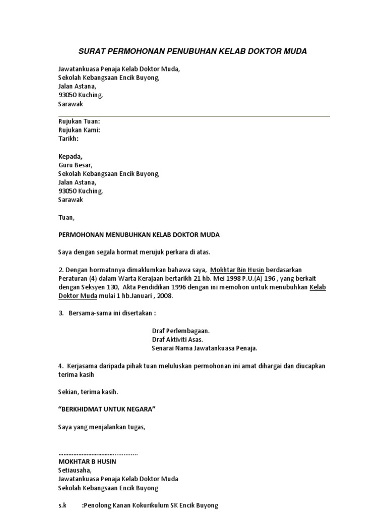 Lampiran 1 contoh surat permohonan penubuhan pasukan pakaian seragam kelab persatuan dan kelab sukan permainan jawatankuasa penaja pergerakan pengakap sekolah menengah kebangsaan raja tun uda jalan tengah 11950 pulau pinang rujukan tuan. Perak darul ridzuan tarikh. Kerjasama dan jasa baik tuan bagi meluluskan perkara diatas terlebih dahulu. Contoh surat permohonan penubuhan pasukan pakaian seragam kelab persatuan dan kelab sukan permainan sk alor pongsu rujukan tuan.