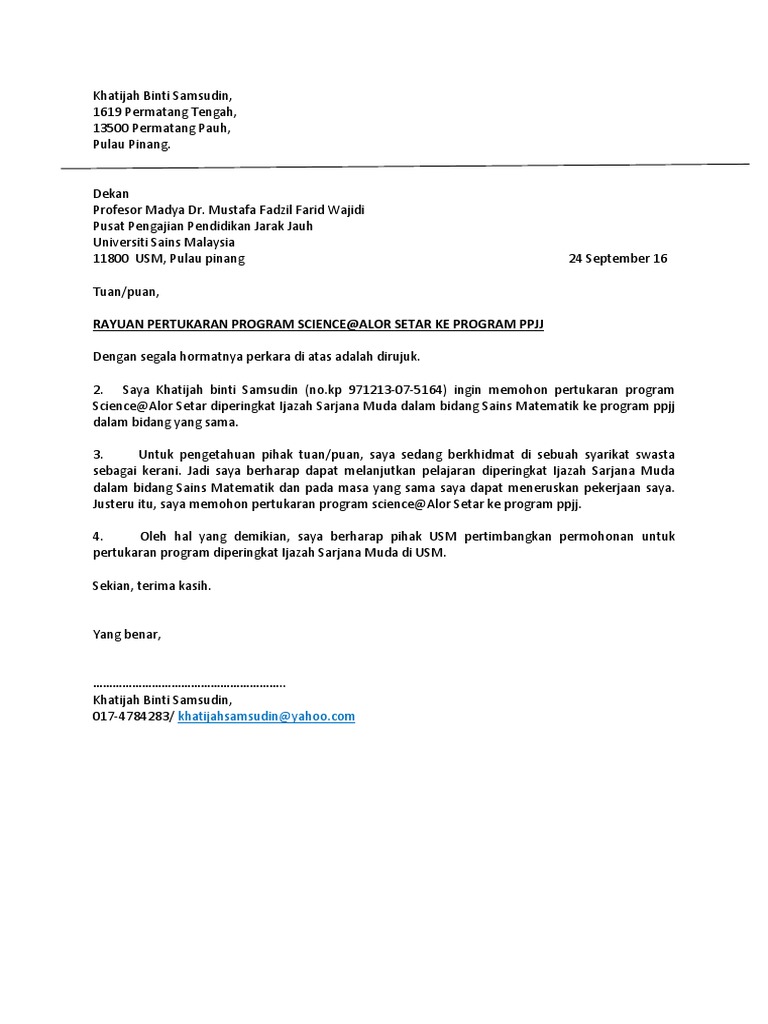 Contoh surat rasmi permohonan pertukaran program pengajian. Contoh surat rasmi permohonan pertukaran program pengajian panduan admin may 16 2017 june 28 2019 cara pengeluaran wang kwsp untuk tujuan pendidikan dan syarat utama. Maka kami kongsikan contoh permohonan surat tersebut. Walau bagaimanapun beliau perlu mendaftar seperti kursus yang ditawarkan dan kemudian mendapat kelulusan pertukaran program pengajian. Sebelum kami kongsikan suka kami ingatkan walaupun anda memohon tidak semestinya permohonan akan diluluskan anda perlu mendaftar di universiti yang ditawarkan sebelum membuat rayuan.