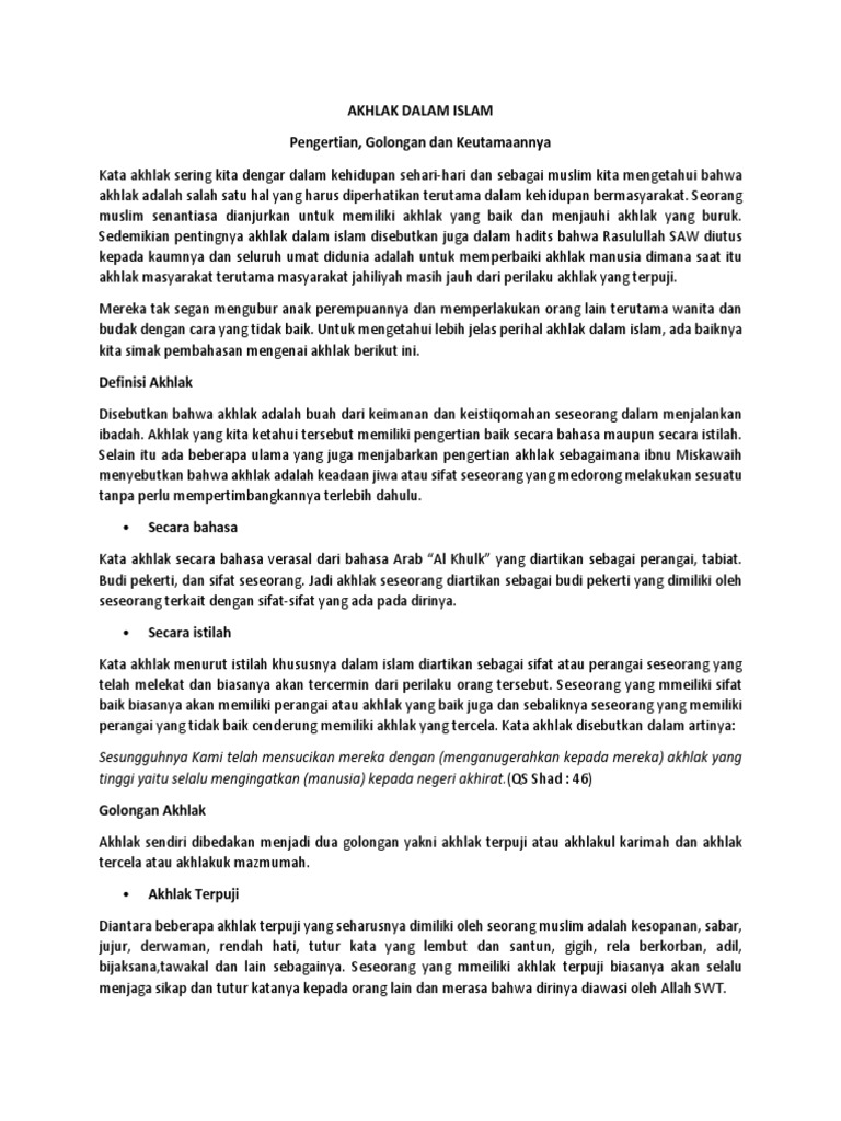 Dan sesungguhnya kamu benar benar berbudi pekerti yang agung keseluruhan akhlak rasulullah ini juga diungkapkan oleh aisyah r a. Pengertian akhlak dalam islam pengertian akhlak dalam islam menurut para ahli. Contoh akhlak tercela diantaranya adalah dusta baca bahaya berbohong dan hukumnya dalam islam iri dengki ujub fitnah sombong bakhil tamak takabur hasad aniaya ghibah riya dan sebagainya. Akhlak islam dengan kerelaan hatinya sendiri bukan dibuat buat atau dipaksa paksa.