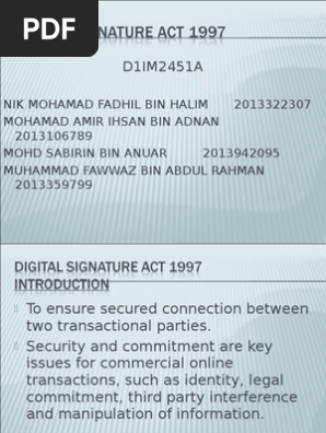Digital signature act 1997. The digital signature act 1997 dsa 1997 which came into force on 1st october 1998 with the purpose of regulating the use of digital signature in malaysia ensures the security of legal issues related to electronic transactions and verifies the use of digital signatures through certificates issued by licensed certification authority ca. Akta tandatangan digital 1997 is a malaysian laws which enacted to make provision for and to regulate the use of digital signatures and to provide for matters connected therewith. Part ii cite the commission and the licensing of certification authorities 3 appointment of commission cite. Arrangement of sections long title preamble.