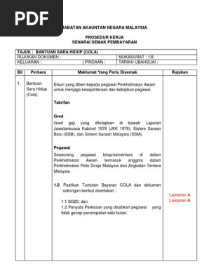 Mungkin akan naik atau turun ia bergantung kepada keperluan dan tahap kemampuan perbelanjaan negara. Kenaikan kadar bantuan sara hidup adalah bertujuan. Kawasan b bantuan sara hidup cola 5 6 dipinjamkan ke badan antarabangsa atau syarikat swasta 5 7 dibayar elaun perbezaan sara hidup 5 8 diluluskan cuti belajar di luar negara melebihi satu 1 tahun 5 9 bercuti tanpa gaji 6 0 kadar kelayakan pegawai 6 1 pastikan kadar kelayakan cola adalah mengikut kawasan pentadbiran pihak berkuasa tempatan. Kaedah pelaksanaan dan kadar bantuan sara hidup dibayar mengikut tempat kerja pejabat pegawai atau institusi pengajian bagi pegawai yang diluluskan cuti belajar kursus jangka panjang dalam negara.