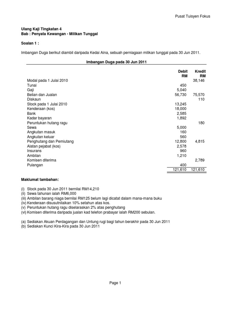 Berikut ialah jawapan bagi latihan penyata kewangan milikan tunggal. Cg narzuki october 30 2009 at 11 13 pm. Format penyata kewangan penyata pendapatan dan kunci kira kira nama perniagaan penyata pendapatan bagi tempoh berakhir masukkan tarikh hasil jualan jualan tolak. Jadi insurans sebagai belanja dalam penyata pendapatan ialah rm4950 dan insurans terdahulu rm450 direkod sebagai aset semasa di kunci kira kira.