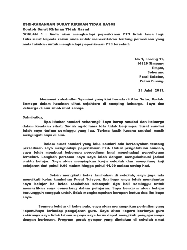 Contoh karangan surat kiriman tidak rasmi format pt3 rasmi x. Contoh karangan penulisan yang diberikan di bawah boleh dijadikan sebagai rujukan dan panduan bagi para pelajar pt3 untuk menulis karangan surat kiriman tidak rasmi yang terbaik dari segi kualiti dan mutunya mengikut format yang telah ditetapkan. 2 surat kiriman tidak rasmi ditulis untuk bertanyakan khabar menyampaikan ucapan tahniah salam takziah dan sebagainya. Surat kiriman tidak rasmi adalah satu surat bertulis yang bersifat peribadi dan pada kebiasaannya ditulis.