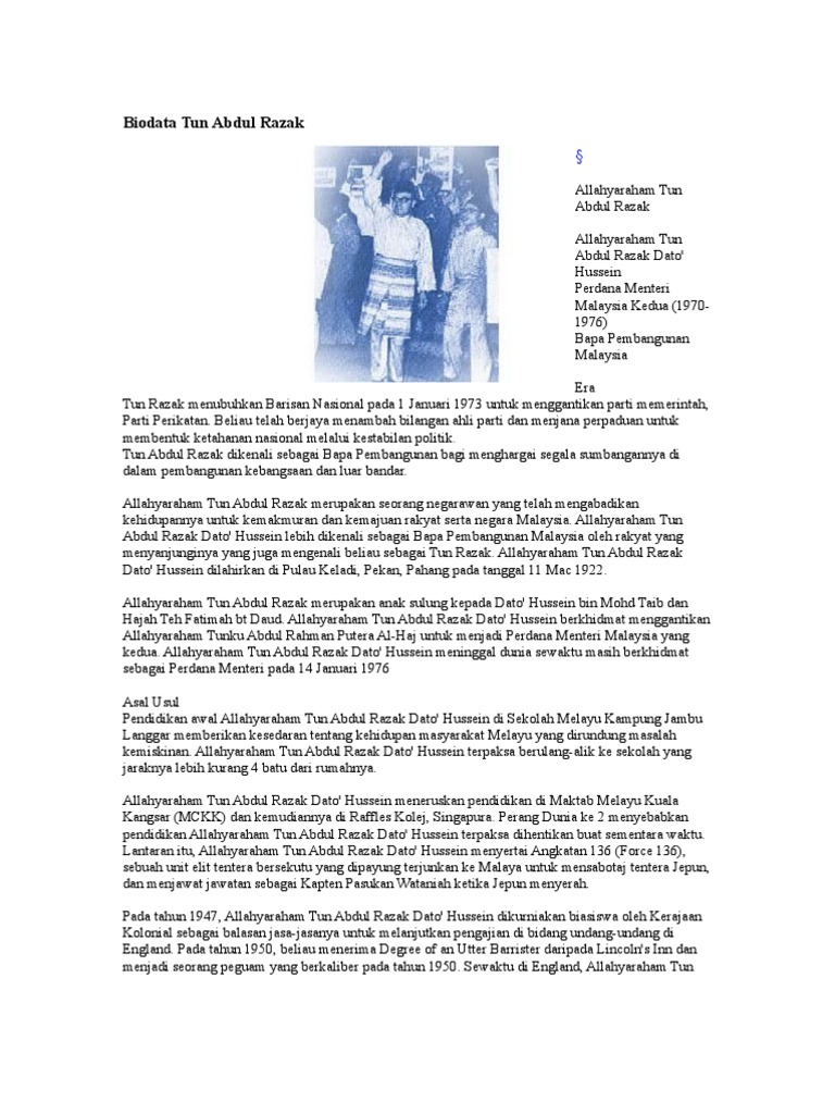 Tun razak was the prime minister responsible in setting up barisan nasional which is the ruling coalition of. Beliau dilahirkan pada 23 julai 1953 di kuala lipis pahang. View sumbangan tokoh tun abdul razak pptx from psv 934 at sekolah menengah kebangsaan sultan ahmad tajuddin. Kembalinya allahyarham tun abdul razak ke rahmatullah pada 14 januari 1976 mengejutkan semua pihak kerana tiada siapa tahu penyakit yang dihidapi beliau.
