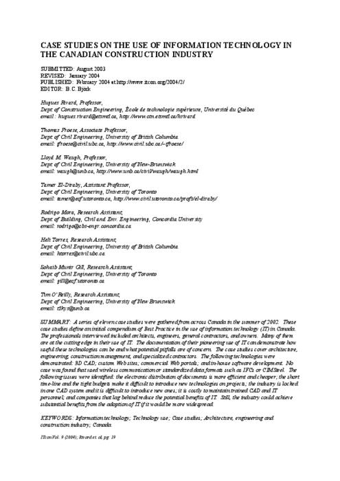 A growing awareness in the construction industry has emerged to pay a sharp attention to ict as a catalyst that would mitigate the deficiencies characterized by this industry. Information technologies or software applications are available to support most aspects of a construction project. Construction process and enterprise modelling reengineering of the construction process using it as an enabling technology methods of concurrent engineering it supported communication across or within disciplines and life cycle stages hypermedia internet videoconferencing etc databases translation methodologies remote communication between programs shared object libraries and other. Electronic journal of information technology in construction citations.