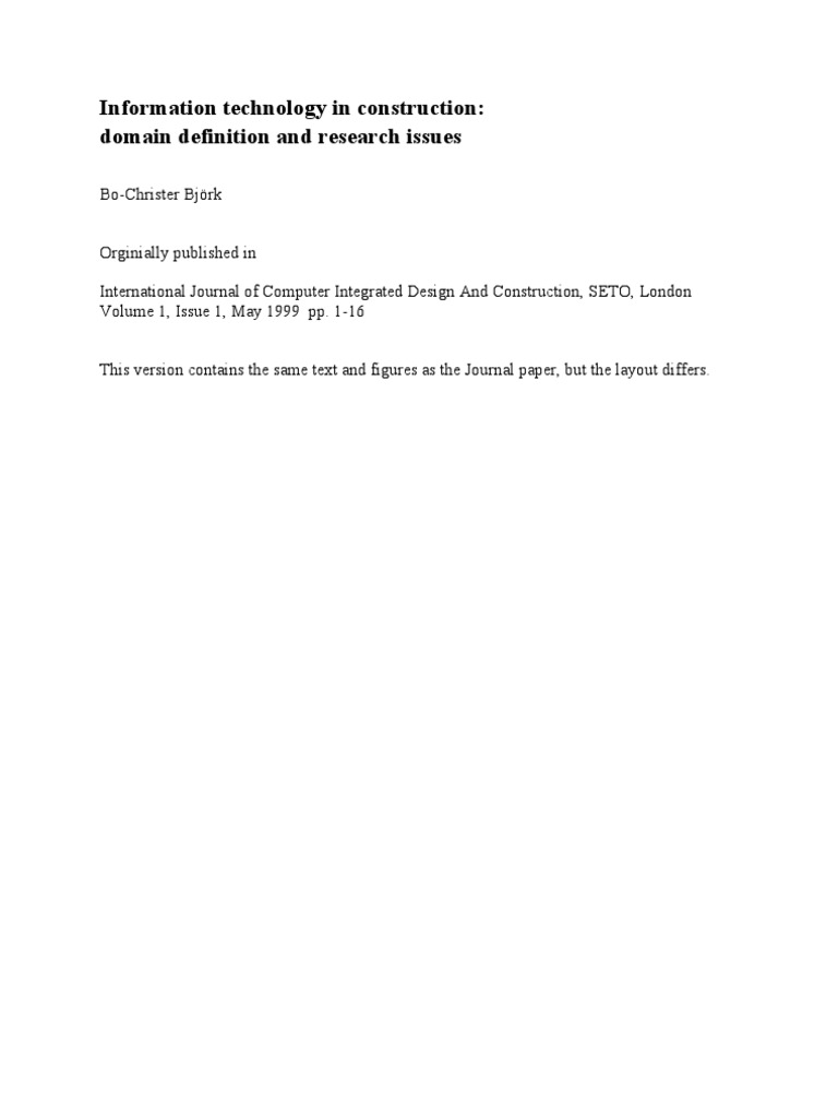 Journal of information technology in construction. The focus is on presenting research results dealing with or having relevance across disciplines and or life cycle stages. 411 the pace of technological innovation in. Users are allowed to read download copy distribute print search or link to the full texts of the articles or use them for any other lawful purpose without asking prior permission from the publisher or the author. There are other.