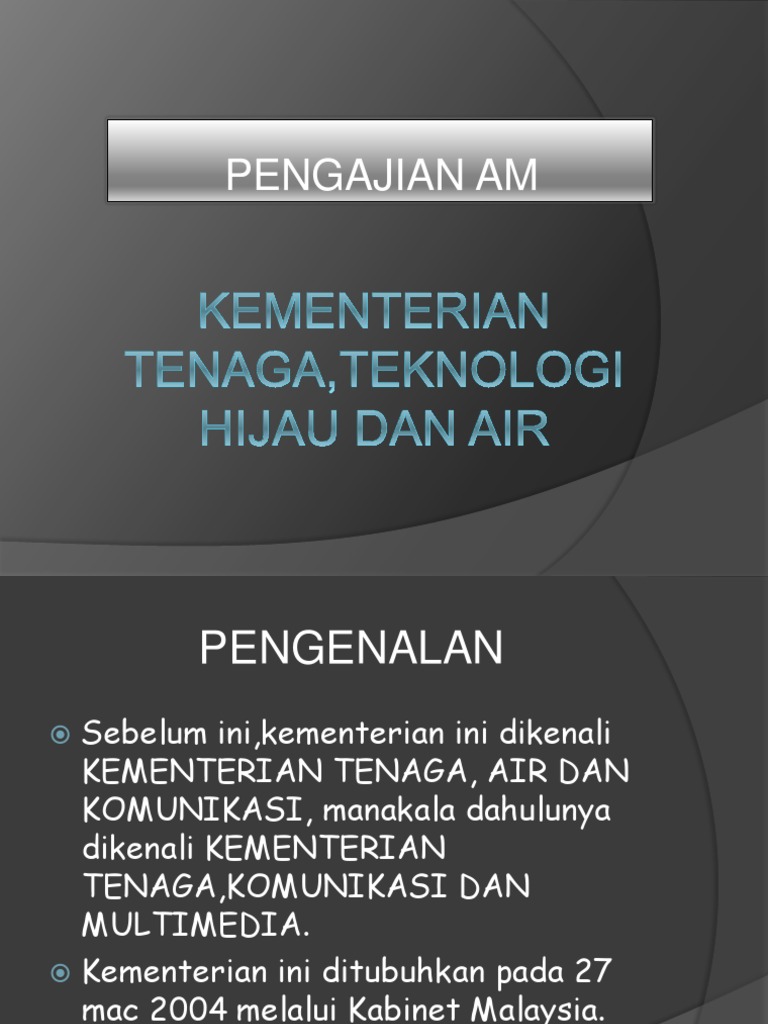 Berikutan rombakan kabinet 2009 tersebut satu fungsi baru telah dimasukkan ke dalam kettha iaitu teknologi hijau. Kementerian tenaga air dan komunikasi dasar tenaga negara terdapat 3 objektif utama dasar tenaga negara yang memainkan peranan penting sebagai panduan kepada pembangunan sektor tenaga pada masa hadapan. Kementerian tenaga dan sumber asli wisma sumber asli no 25 persiaran perdana presint 4. Kementerian tenaga air dan komunikasi.
