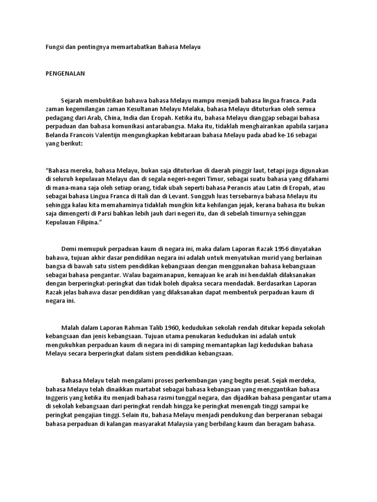 Abstrak seperti yang termaktub dalam perkara 152 perlembagaan persekutuan bahasa telah dimartabatkan sebagai bahasa kebangsaan dan asas pemb. Dalam usaha memperkasakan bahasa kebangsaan peranan guru amatlah mustahak kerana melalui pendidikan murid murid perlu disedarkan mengenai kepentingan bahasa melayu sebagai bahasa kebangsaan bahasa rasmi bahasa perpaduan dan bahasa komunikasi di malaysia. Sejak merdeka bahasa melayu telah dinaikkan martabat sebagai bahasa kebangsaan yang menggantikan bahasa inggeris yang ketika itu menjadi bahasa rasmi tunggal negara dan dijadikan bahasa pengantar utama di sekolah kebangsaan dari peringkat rendah hingga ke peringkat menengah tinggi sampai ke peringkat pengajian tinggi. Bahasa malaysia adalah sebuah bentuk standard bahasa melayu yang dipiawaikan mengikut tetapan daripada dewan bahasa dan pustaka sebagai bahasa kebangsaan negara malaysia.