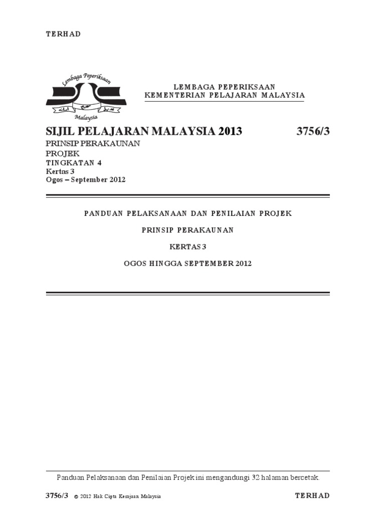 Calon sijil pelajaran malaysia spm yang mengambil mata pelajaran prinsip perakaunan dikehendaki melaksanakan tugasan projek sebagai satu daripada keperluan persijilan. 1 file s 384 64 kb. 3756 3 prinsip perakaunan panduan pelaksanaan. Kerja kursus prinsip perakauanan tingkatan 4 tahun 2016 ogos september 2016 sijil pelajaran malaysia.