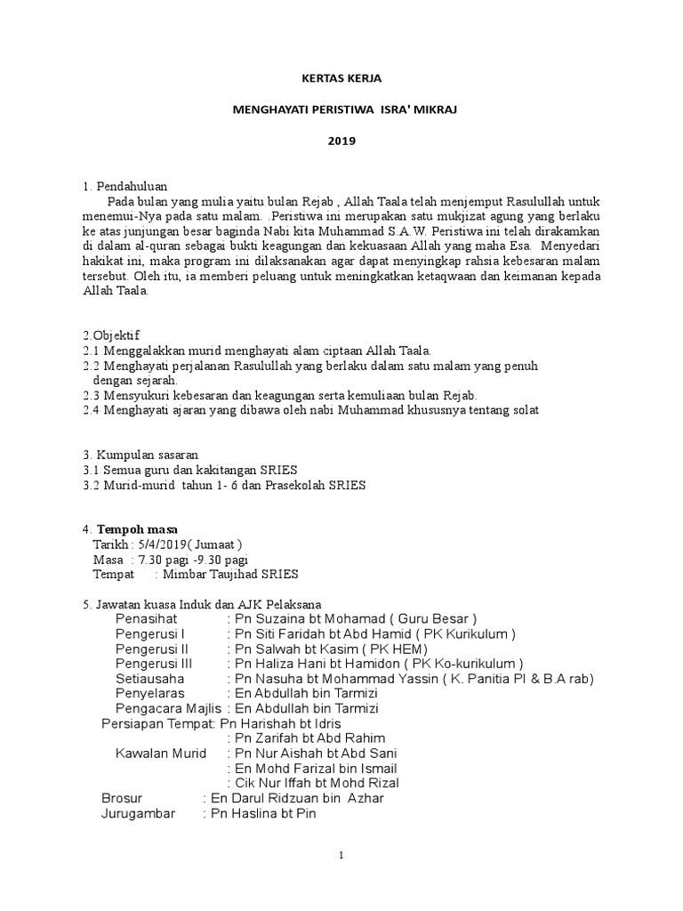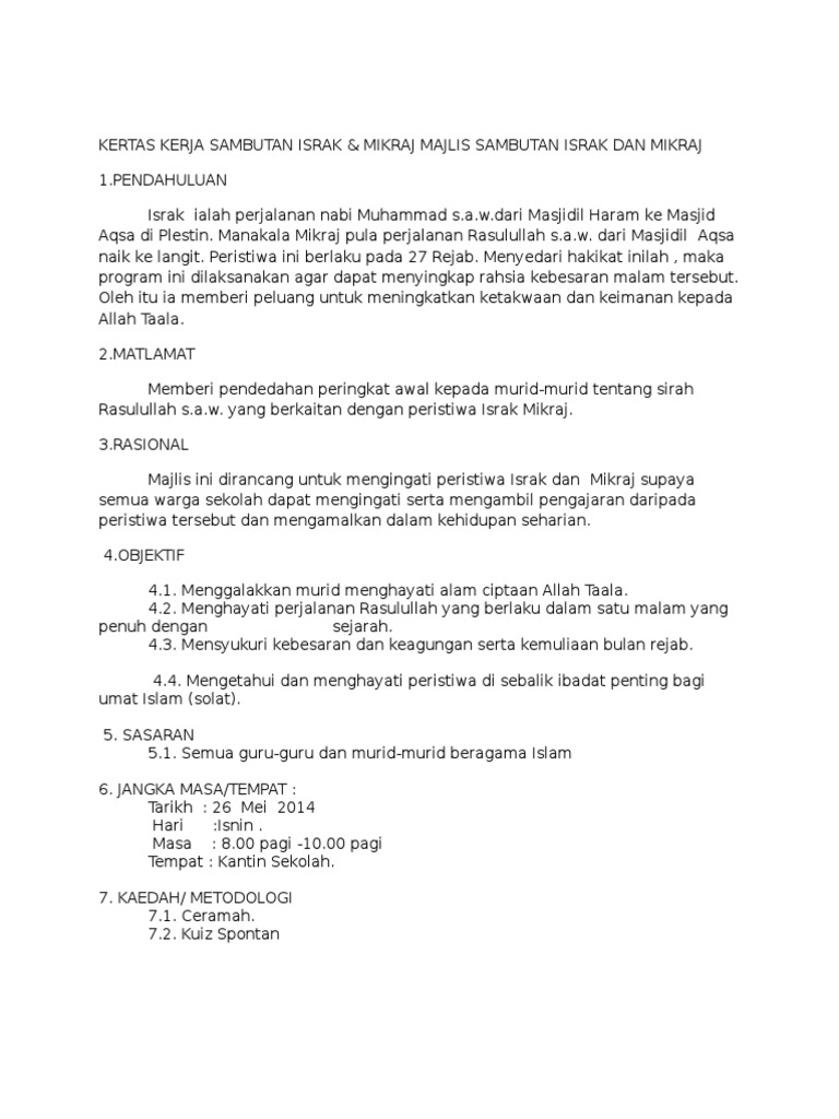 Kertas kerja israk mikraj 2018 1 1. Kertas kerja sambutan israk mikraj majlis sambutan israk dan mikraj. Sebelum ini admin ada kongsikan kertas kerja israk dan mikraj dan kali ini admin ingin kongsikan beberapa koleksi soalan kuiz israk dan mikraj mengapa perlu buat kuiz antara sebabnya ialah dengan membuat kuiz israk mikraj ini murid akan mula berminat untuk mengetahui dan membaca serta mendengar apakah itu israk mikraj dan intipati di dalamnya. Contoh kertas kerja program sambutan isra mikraj.