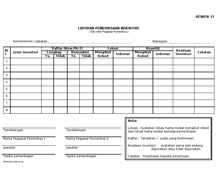 Upa kementerian kew pa 10 kew pa 11 dan kew pa 12 10. Kew pa 11 laporan pemeriksaan inventori diisi oleh pegawai pemeriksa daftar lengkap kemaskini lokasi kuantiti bil jenis inventori yatidakyatidak. Potong mana yang berkenaan kew pa 10 borang aduan kerosakan aset alih bahagian i untuk diisi oleh pengadu. Pekeliling perbendaharaan malaysia am 2 4 lampiran b nota.