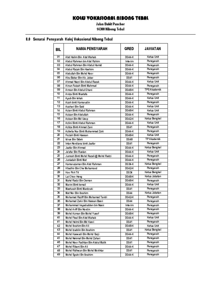 Senarai kolej vokasional kv dan kursus ditawarkan pasti ramai pelajar lepasan tingkatan 3 yang berminat untuk menyambung pengajian menengah atas di kolej vokasional kv dan sekolah menengah teknik smt dengan permintaan pekerjaan dalam bidang kemahiran ianya merupakan pilihan alternatif buat pelajar dengan sijil svm kini juga setara dengan sijil pelajaran malaysia spm. Ia mulanya dikenali sebagai sekolah menengah vokasional nibong tebal dan kemudiannya melalui pengstrukturan semula pada tahun 1995 menjadi sekolah menengah teknik nibong tebal. Portal kolej vokasional nibong tebal. Kolej vokasional nibong tebal jalan bukit panchor 14300 nibong tebal pulau pinang tel.