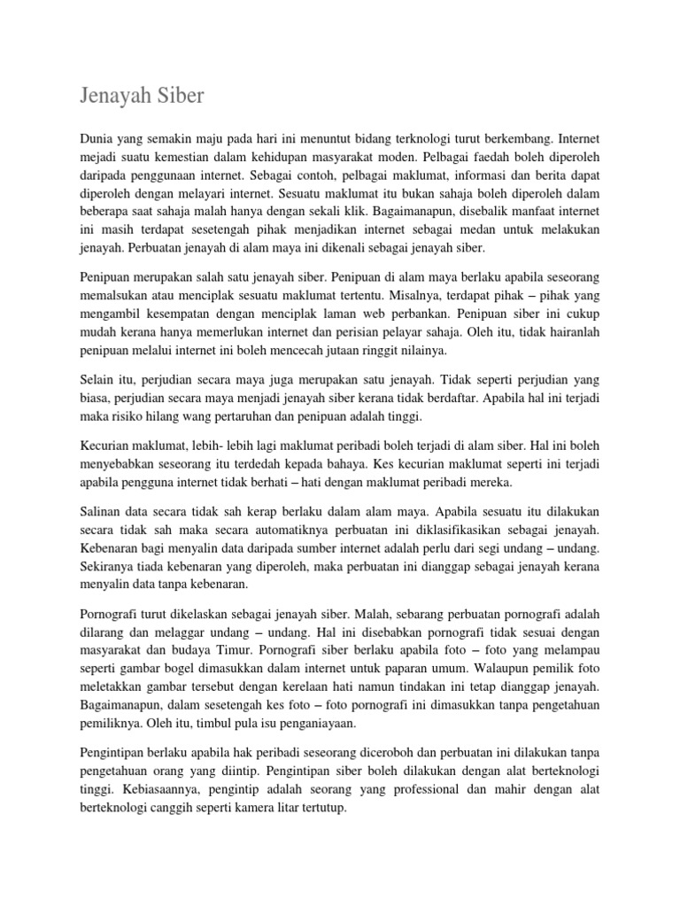 Berdasarkan maklumat pusat keselamatan ict dan tindak balas kecemasan kebangsaan miser bagi tempoh tahun 1998 hingga 2007 ancaman dan serangan siber itu menunjukkan trend meningkat iaitu daripada kira kira 340 aduan kepada hampir 40 ribu aduan. Academia edu is a platform for academics to share research papers. Antara inisiatif yang dapat kita ambil sebagai langkah mencegah jenayah yang merupakan isu terpenting di negara ini ialah dengan mewujudkan konsep bandar dan pekan selamat. Undang undang siber tidak boleh kita harapkan untuk melindungi kita dari ancaman jenayah siber.