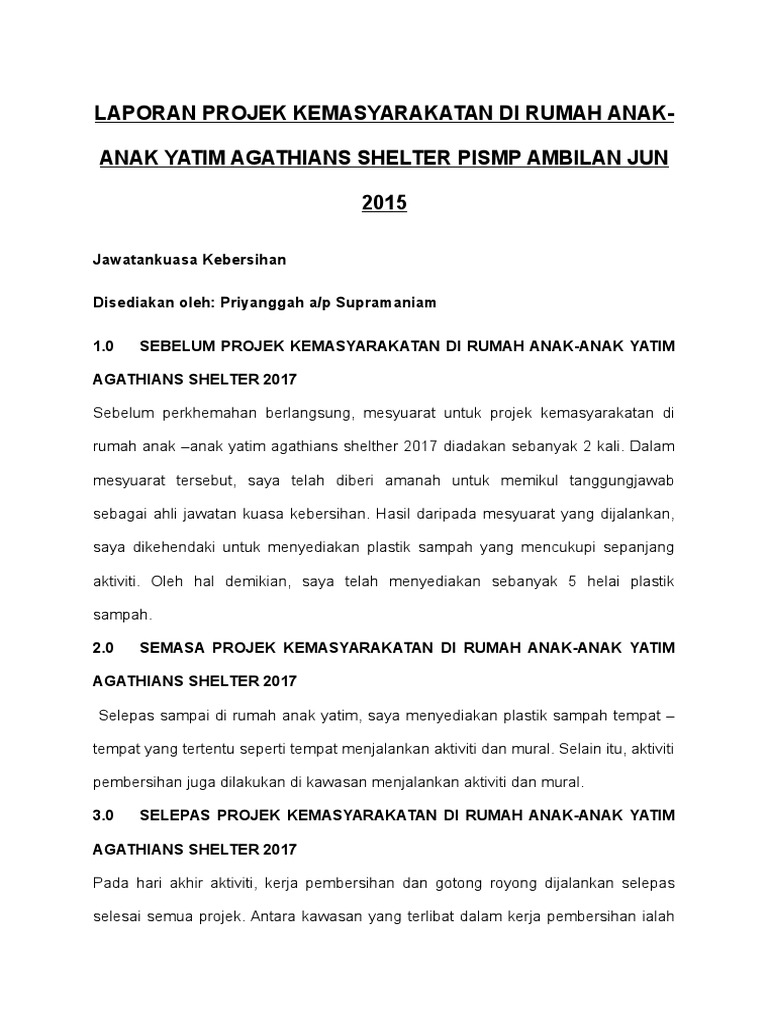Laporan aktiviti gotong royong di rumah anak yatim. Selepas itu semua guru dan murid murid ke kantin untuk rehat dan sarapan pagi. Pihak unicommserv telah manganjurkan program kemasyarakatan di rumah anak anak yatim yang dipilih berdasarkan persetujuan daripada pihak pusat peradaban islam cicu dan pengurusan rumah kebajikan di sekitar selangor program selama 2 hari bermula seawal 7 pagi hingga 4 petang pada 24 haribulan dan diteruskan lagi dari pukul 7 pagi hingga 5 petang pada 25 mac 2012 program ini telah diadakan di. Pada 23 april 2019 pihak jkr putrajaya bahagian senggara kuarters bersama pihak kontraktor alam bersih sdn bhd telah menganjurkan aktiviti gotong royong di rumah anak yatim darul izzah teras jernang kajang. Melalui kursus ini pelajar dikehendaki merancang melaksanakan dan membuat laporan projek yang dilaksanakan.