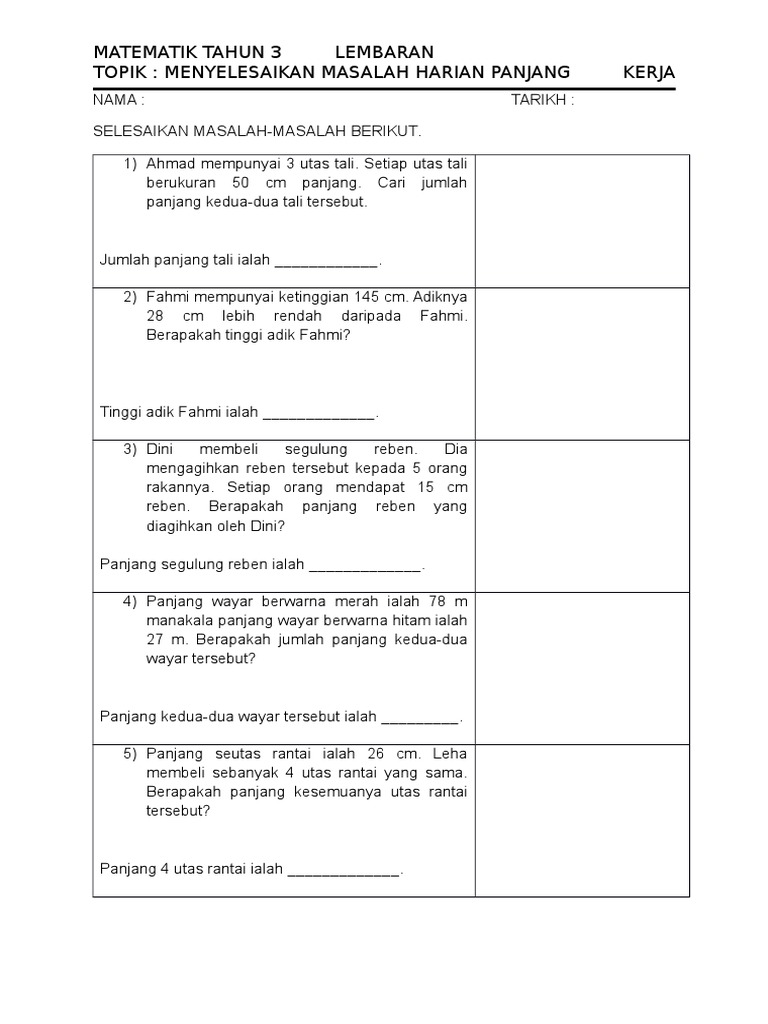 Lembaran Kerja Matematik Tahun 3 Panjang