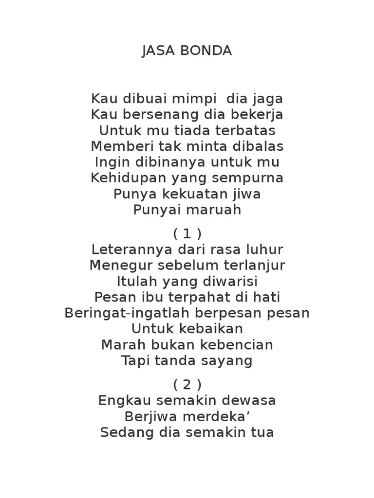 Lirik dan chord lagu malaysia dan indonesia. Lirik lagu warisan jasa bonda. Kau dibuai mimpi dia jaga kau bersenang dia bekerja untukmu tiada terbatas memberi tak minta dibalas. Dan kami wajibkan manusia berbuat baik kepada kedua ibu bapanya.