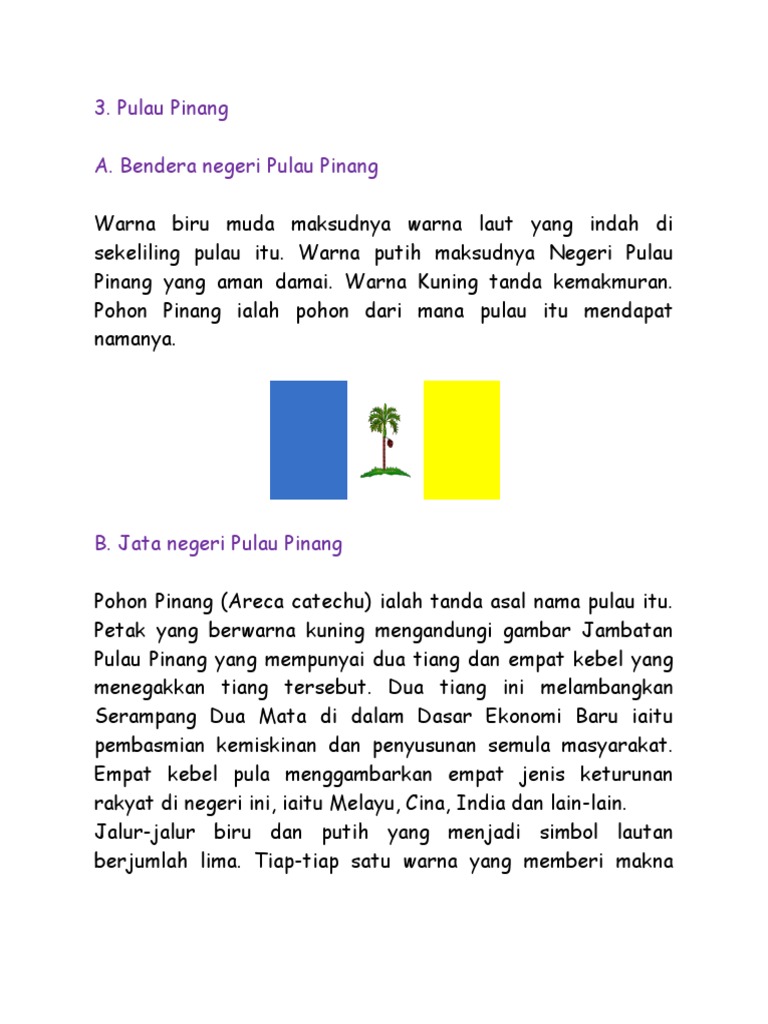 Maksud jata negeri pulau pinang. Empat buah negeri ini ialah negeri negeri melayu bersekutu yang asal. Warna kuning melambangkan kemakmuran. Pohon pinang ialah tanda asal nama pulau itu. Terletak berhampiran dengan persisiran barat laut semenanjung malaysia dipisahkan diantara negeri kedah di sebelah utara dan timur negeri perak di sebelah selatan dan perairan selat melaka dan sumatera di sebelah barat pulau pinang terdiri daripada bahagian pulau dan juga tanah besar yang dikenali sebagai seberang.