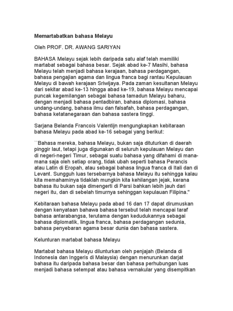 Walau bagaimanapun kesedaran para pemimpin dan rakyat akan kesan buruk pelaksanaan ppsmimenunjukkan satu usaha memartabatkan bahasa melayu sebagai bahasa ilmu 3 5 bahasa melayu di institusi pengajian tinggiusaha memartabatkan bahasa melayu di malaysia bukan sahaja dapat dilihat padaperingkat sekolah malah pada peringkat universiti atau pusat pusat pengajian tinggipun menggunakan bahasa. Dalam konteks melihat kemampuan bahasa melayu sebagai wahana ilmu abdullah hassan 1997. 1 0 pendahuluan 1 1 pengenalan bahasa ialah maruah bangsa dan negara. Bahasa melayu akan terus menghadapi cabaran dalam memenuhi peranannya sebagai wahana kebudayaan moden.
