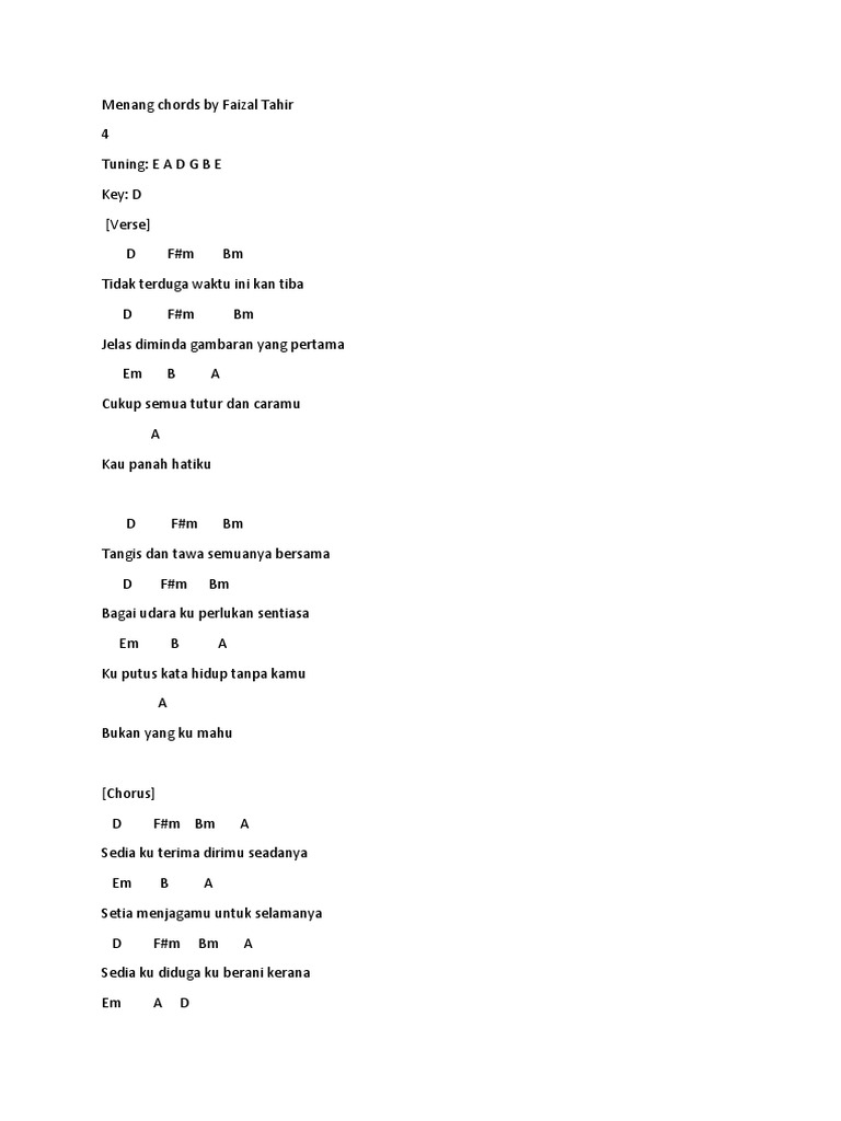 Lihat kord faizal tahir menang chord hanya di chord indonesia. Faizal tahir menang capo 1 verse d f m bm tidak terduga waktu ini kan tiba d f m bm jelas diminda gambaran yang pertama em b a cukup semua tutur dan caramu a kau panah hatiku d f m bm tangis dan tawa semuanya bersama d f m bm bagai udara ku perlukan sentiasa em b a ku putus kata hidup tanpa kamu a bukan yang ku mahu chorus d f m bm a sedia ku terima dirimu seadanya em b a setia menjagamu. Faizal tahir menang chord verse. Faizal tahir menang chord artist.