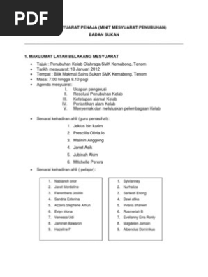 Beliau menerangkan tujuan mengadakan mesyuarat ini ialah untuk menubuhan persatuan. 10 1 4 minit mesyuarat agung penubuhan. Mohd ali bin safari. Bil nama kad pengenalan alamat telefon 1 mohd sani bin mat isa 2 mohd fazreen bin rosdei.