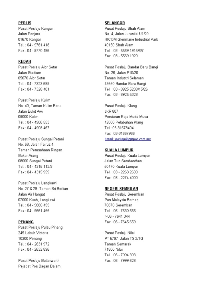 Uploaded by farah atiqah. Pejabat pos arau jkr 533 jalan besar arau 02600 arau telefon. Pejabat pos sepang no. Pos laju shah alam glenmarie no.