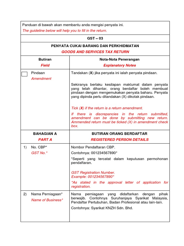 Gst 03 penyata cukai barang dan perkhidmatan goods and services tax return butiran field nota nota penerangan explanatory notes pindaan amendment tandakan x jika penyata ini ialah penyata pindaan. Panduan mengisi borang permohonan panduan guide. 03 8882 2100 2300 head quaters headquarters jabatan kastam diraja malaysia kompleks kementerian kewangan no 3 persiaran perdana presint 2 62596 putrajaya. Panduan di bawah akan membantu anda mengisi penyata ini.