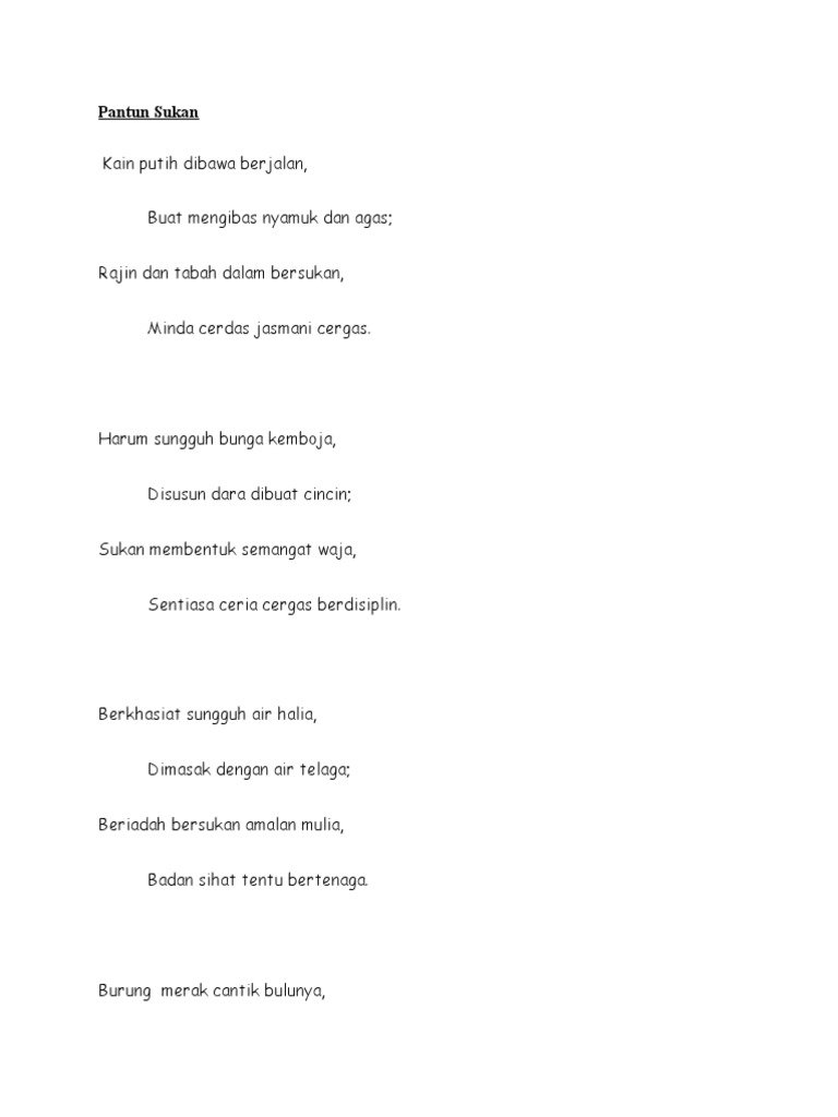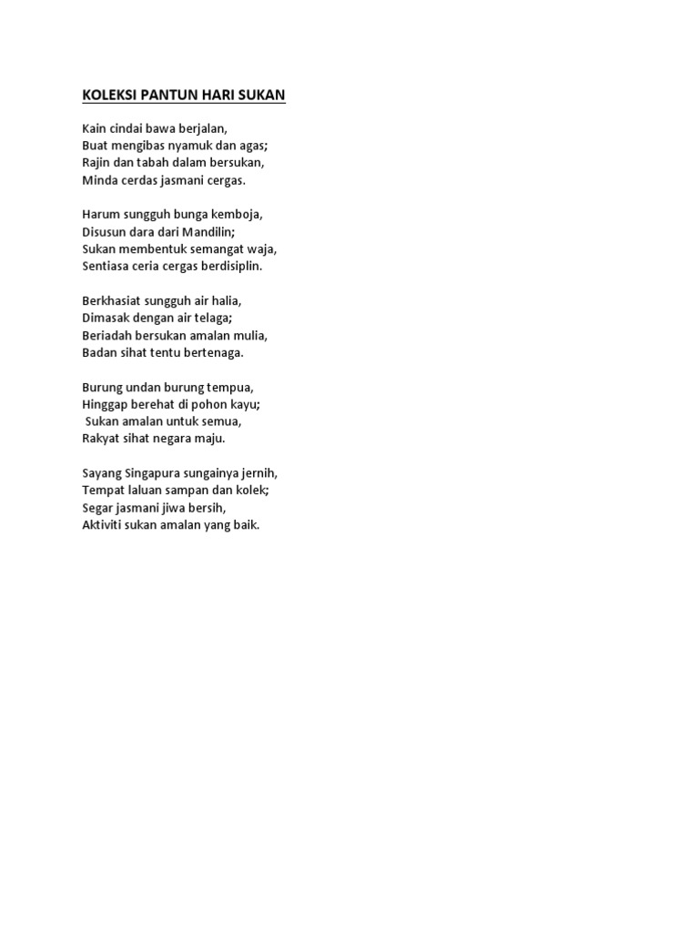 Pantun badan cergas minda cerdas. Makanan sebegini boleh menyebabkan badan kita menjadi gemuk. Bila dilarang janganlah makan cili merah memanglah pedas tolong kaitkan kelapa sebiji air kelapa menghilang dahaga cergas bersukan pandai mengkaji jadi juara guru pun bangga. Kita hendaklah mengurangkan makan makanan yang berlemak dan manis. Beriadah bersukan amalan mulia badan sihat tentu bertenaga.