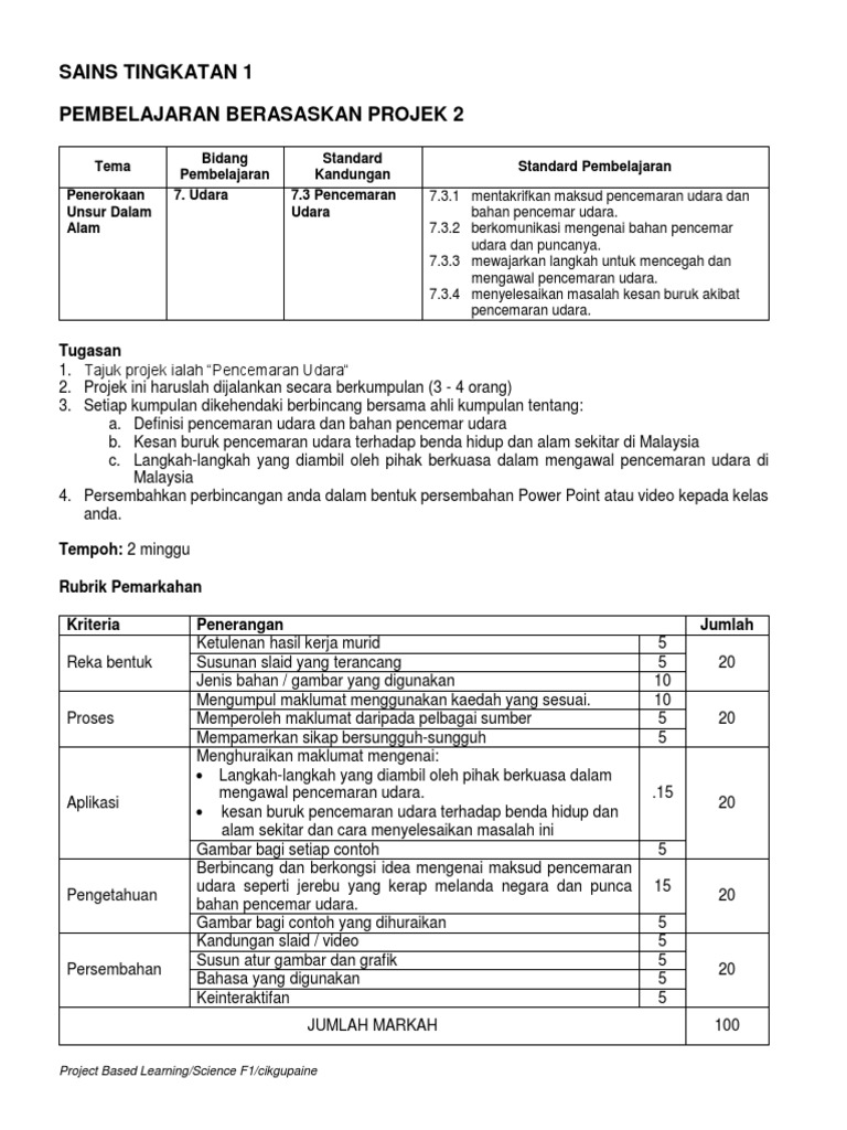 Pbl sains tingkatan 1 pencemaran udara. Definisi pencemaran udara merupakan satu keadaan yang melibatkan pengenalan sebarang bahan kimia jirim zarahanatau bahan biologi yang boleh menyebabkan mudarat ketidakselesaan kepada manusia atau organisma hidup lain serta merosakkan alam sekitar apabila ia dibebaskan ke atmosfera contoh pencemar udara adalah seperti gaskarbon dioksida sulfur dioksida. Hasilnya jauh lebih baik kerana murid juga dapat mempelajari sisi lain pencemaran udara tanpa hanya terlalu fokus pada penghasilan produk akhir. Pencemaran udara ialah keadaan yang melibatkan kehadiran bahan pencemar dalam udara yang menyebabkan ketidakselesaan dan kemudaratan kepada manusia atau organisma hidup yang lain serta merosakkan alam sekitar. Pencemaran udara sains tingkatan 1 2.