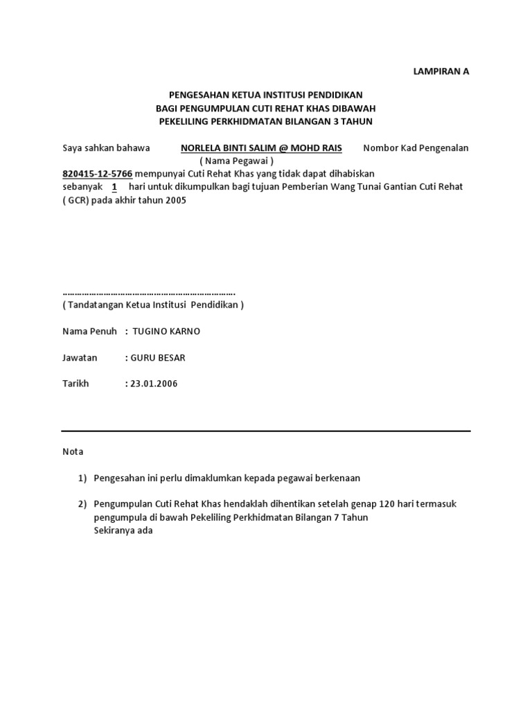 Pekeliling cuti rehat khas tahun 2004. Pekeliling perkhidmatan bilangan 5 tahun 2004 author. Cuti rehat khas sebanyak tujuh 7 hari dalam satu tahun kalendar diperuntukan di bawah pekeliling perkhidmatan bilangan 3 tahun 2005 dan berkuatkuasa pada 1 mac 2004 bagi menggantikan cuti sambilan di bawah pekeliling perkhidmatan bilangan 4 tahun 1977. Cuti rehat dan cuti rehat khas yang dikumpul sehingga 31 disember 2008 diambilkira setakat 120 hari sahaja. Cuti rehat khas dan pengumpulannya bagi.