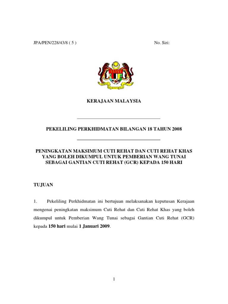 18 tahun 2008 pemberian wang tunai sebagai gantian cuti rehat gcr mulai 1 januari 2009 adalah sebanyak 150 hari. Pekeliling perkhidmatan bilangan 3 tahun 2004 panduan pertukaran pegawai awam. Jpa s 223 8 3 klt 7 47 bertarikh 30 ogos 2005.