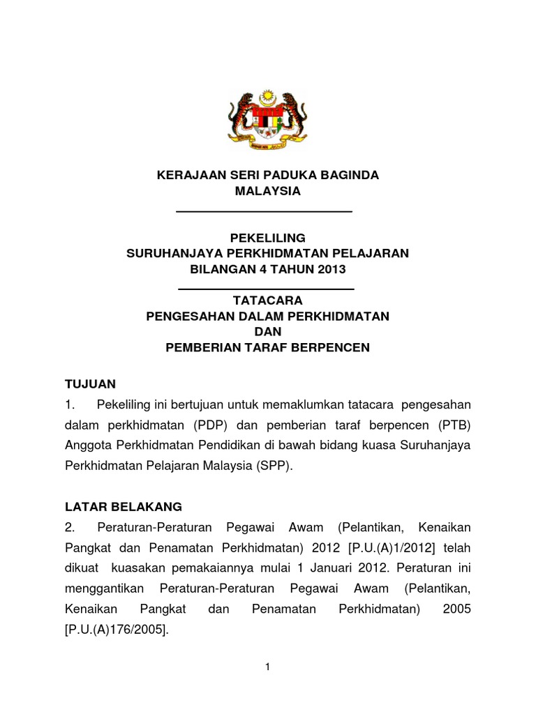 Pekeliling pengesahan dalam perkhidmatan spp. Feb 24 2014 pekeliling spp pengesahan dalam perkhidmatan sah jawatan dg41 syarat sah jawatan tempoh sah jawatan 0 comments. Setiap penjawat awam pasti menunggu bila dia akan disahkan dalam perkhidmatan beberapa syarat yang perlu dilalui sebelum diperakukan dan disahkan dalam perkhidmatan. Surat pekeliling perkhidmatan bilangan 15 tahun 2008 panduan menguruskan buku perkhidmatan kerajaan. Peraturan peraturan pegawai awam pelantikan kenaikan pangkat dan penamatan perkhidmatan 2012 p u a 1 2012.