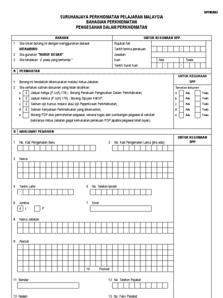 Pengesahan dalam perkhidmatan spp. Senarai semak pengesahan dalam perkhidmatan. Senarai semak perakuan urusan pengesahan dalam perkhidmatan lampiran c. 2 borang spp k 002 3 salinan asal. Suruhanjaya perkhidmatan pelajaran malaysia bahagian perkhidmatan pengesahan dalam perkhidmatan arahan untuk kegunaan spp rujukan fail borang perakuan pengesahan dalam perkhidmatan subperaturan 29 2 dalam perkhidmatan kerana telah menjalankan tugasnya dengan jujur spp strategic partners.