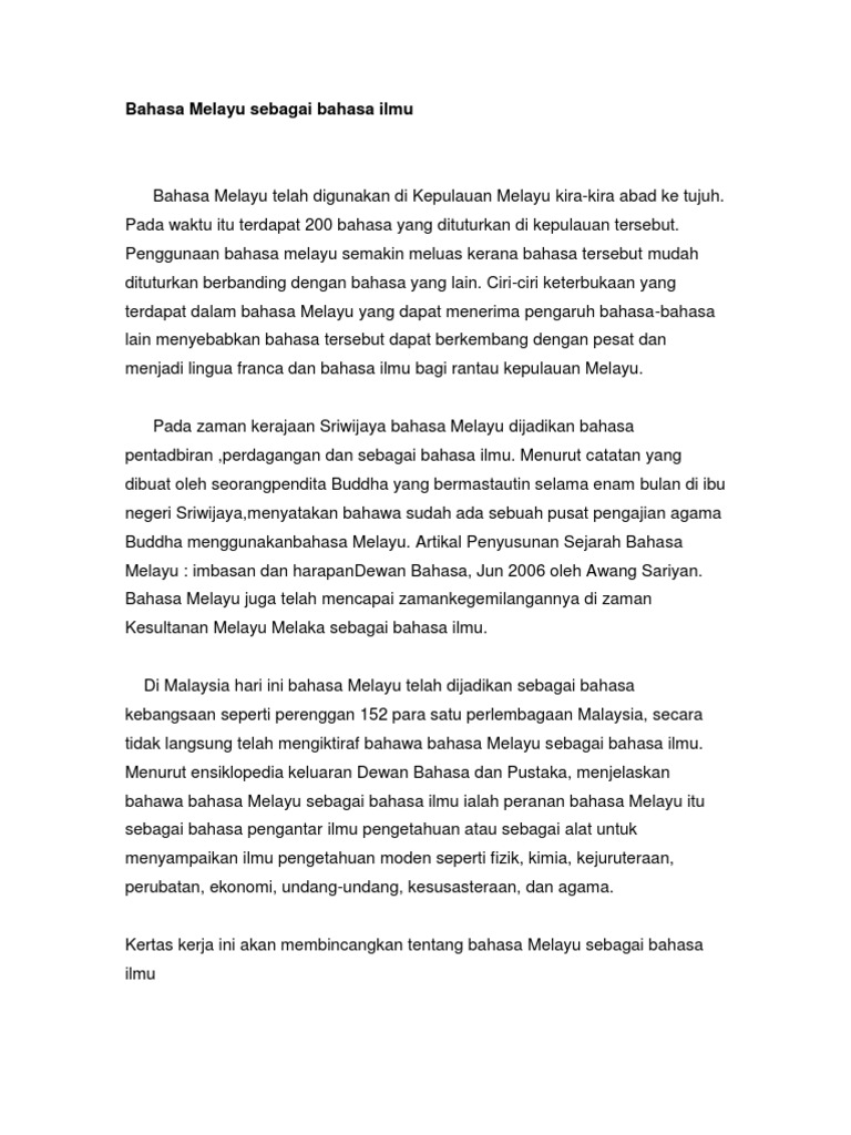 Perakuan bahasa melayu sebagai bahasa ilmu. 259 261 menggariskan sepuluh ciri berdasarkan lima belas ciri yang dikemukakan oleh johannes kongres 1978. Untuk menjelaskan ciri khusus sesuatu bahasa ilmiah awang sariyan 1996. Abstrak seperti yang termaktub dalam perkara 152 perlembagaan persekutuan bahasa telah dimartabatkan sebagai bahasa kebangsaan dan asas pemb. 38 menyarankan permisahan antara bahasa melayu ilmu dan bahasa melayu umum dilakukan.
